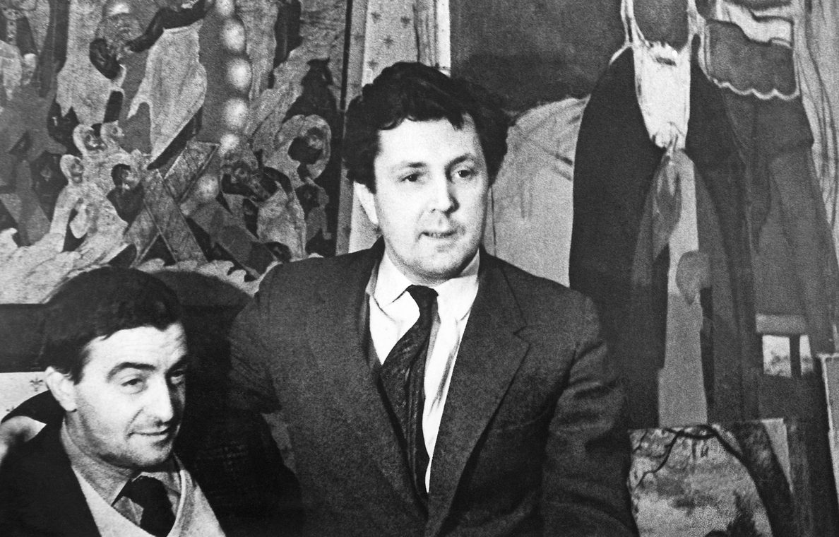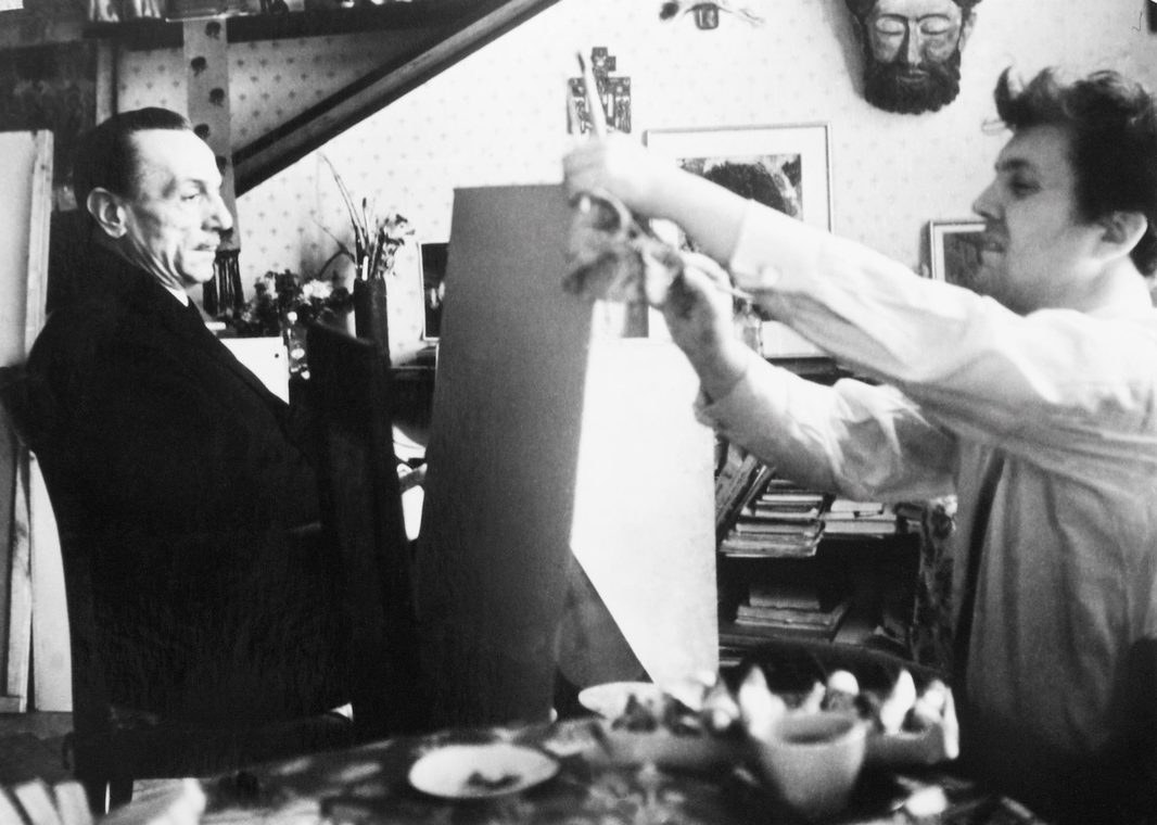 Итальянский режиссер Джузеппе Де Сантис и Илья Глазунов в мастерской художника. Москва