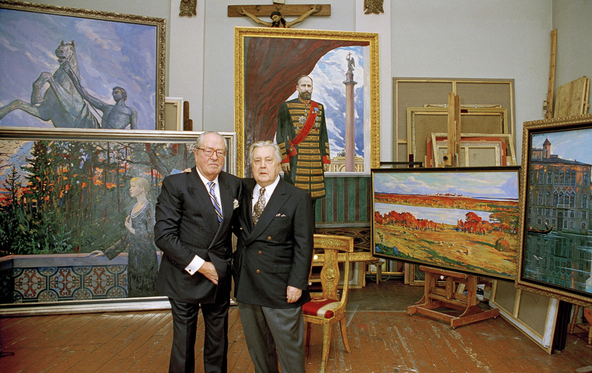 Илья Глазунов и депутат Европарламента, лидер национального фронта Франции Жан-Мари Ле Пен в мастерской художника. Москва