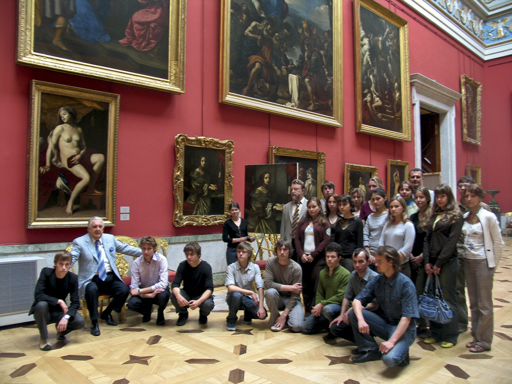Илья Глазунов и руководители копийной практики Сидоров Н.П., Слепушкин Д.А., Арсенюк Ю.М. со студентами в Эрмитаже