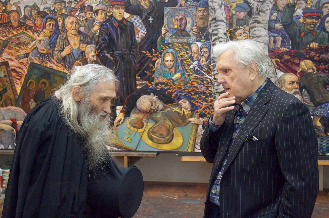 Схиархимандрит Оптиной пустыни Илий и Илья Глазунов в мастерской художника у картины "Раскулачивание"