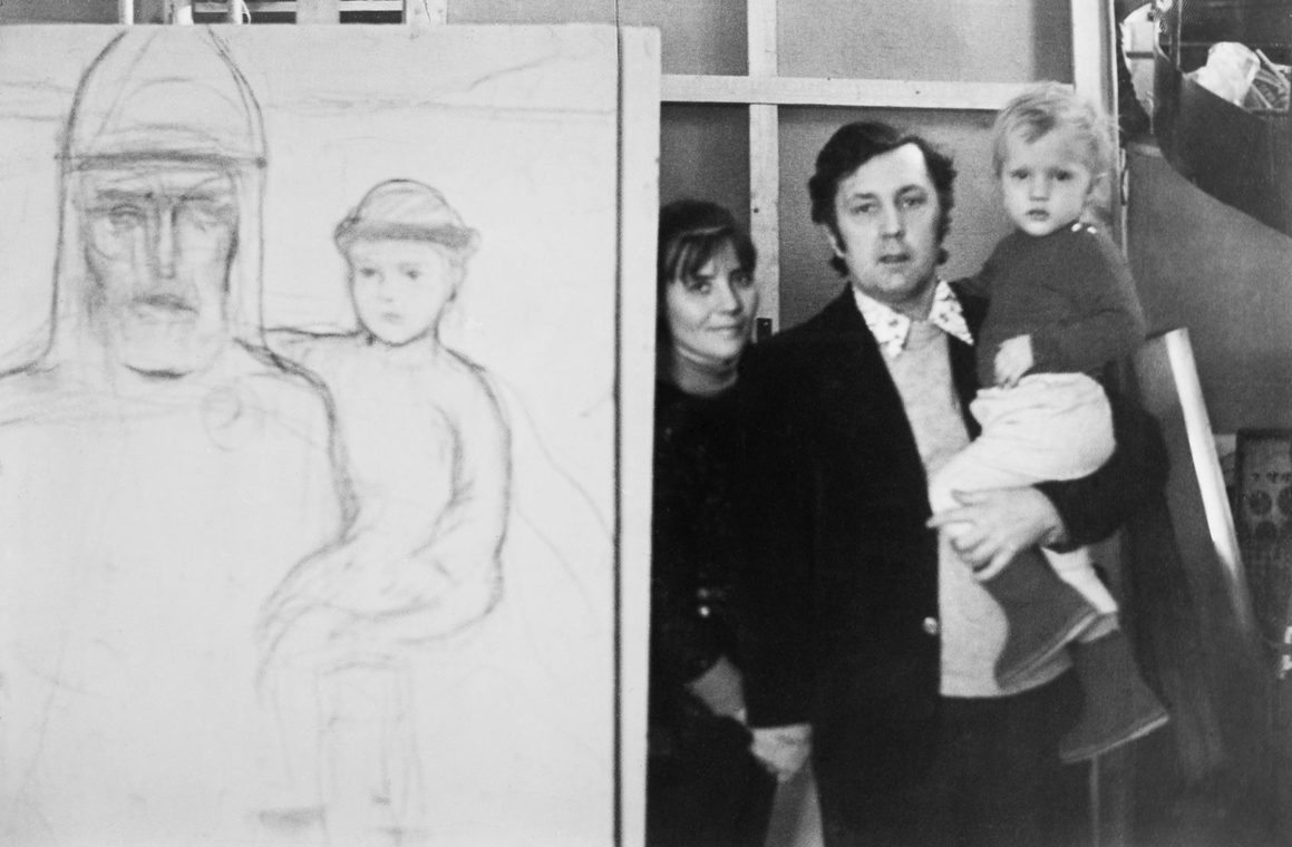 Илья Глазунов с женой Ниной Виноградовой-Бенуа и сыном Ваней у наброска картины «Князь Олег и Игорь»